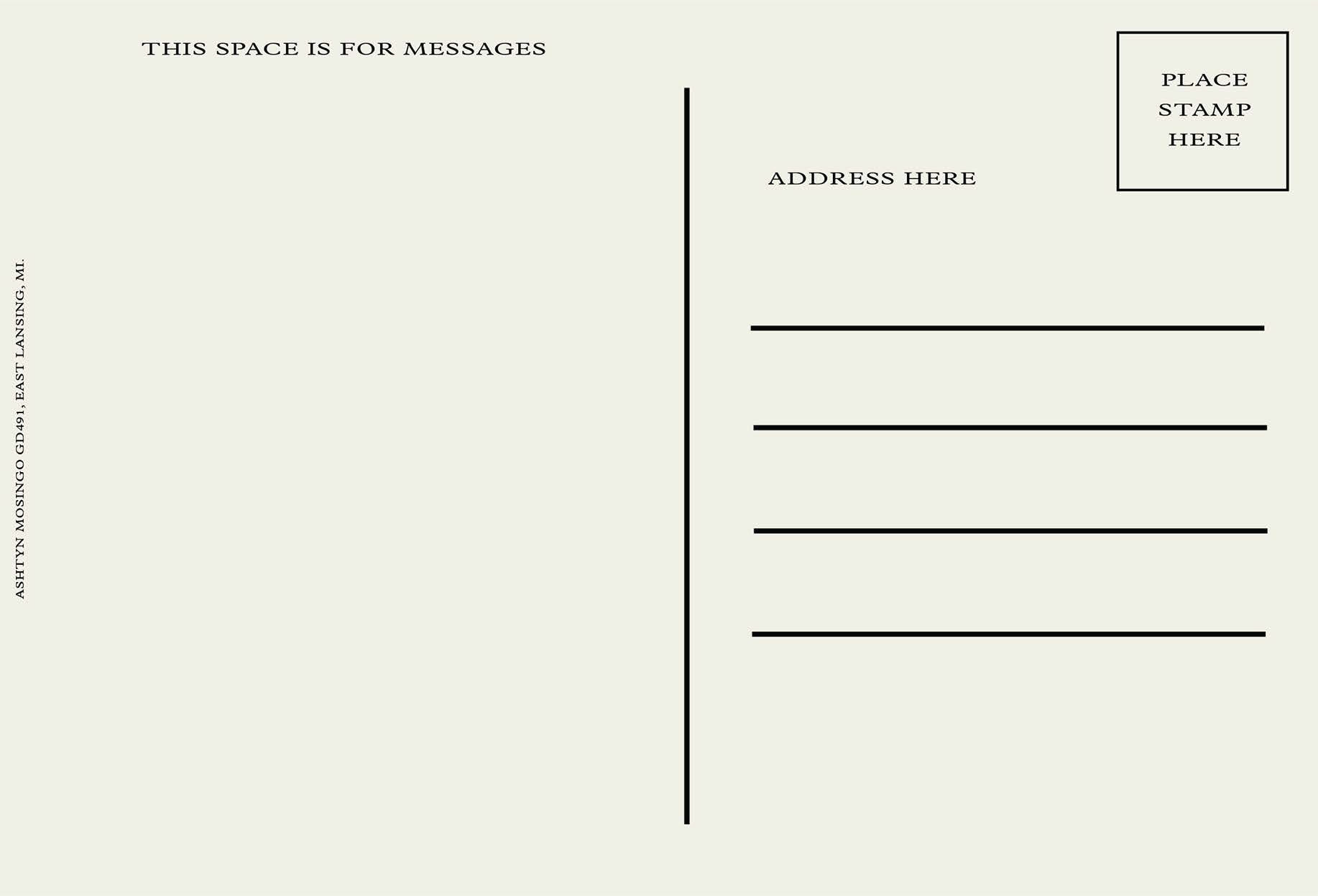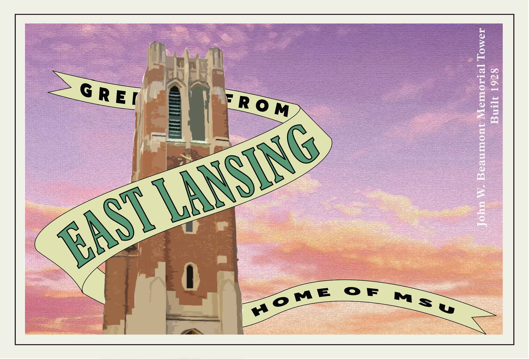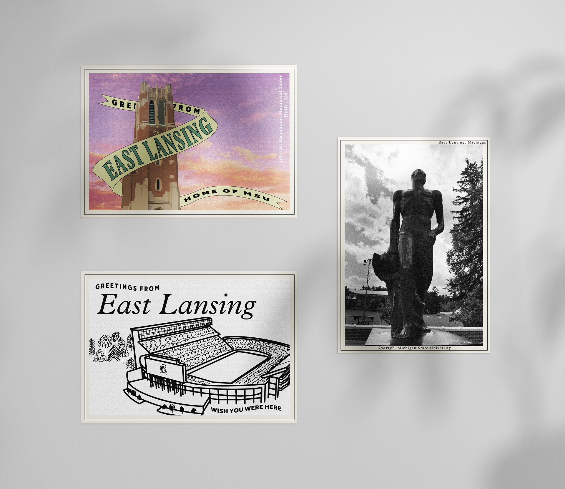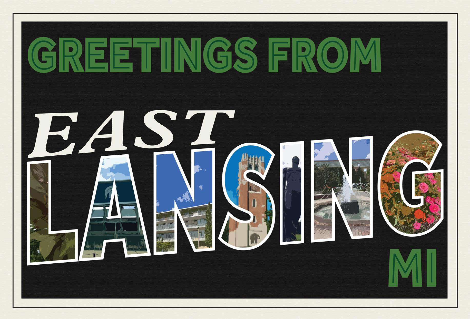 This project explores postcard design as a visual representation of place. Using original photography, I created a series of postcards inspired by vintage postcard aesthetics to capture the character of East Lansing. The designs emphasize color, composition, and nostalgia to communicate a sense of location and memory. Tools: Adobe Illustrator, Photography · Skills: Visual Storytelling, Layout, Place-Based Design, Concept Development